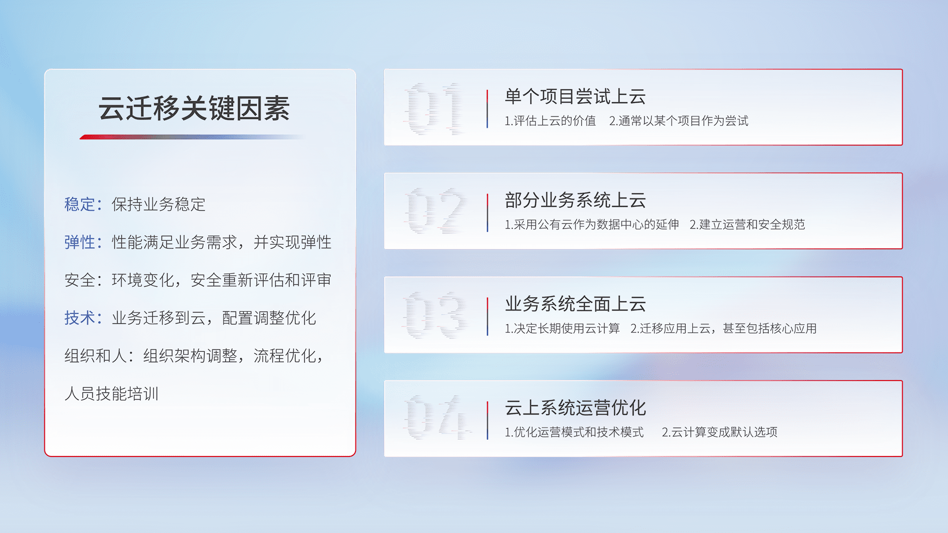结合实际业务,,,,从规划设计、、、、云平台选型、、、云原生改造、、数据迁移、、、、集成交付,,,,迁移全过程为客户识别最佳上云路径,,,做好风险识别管理,,,设计网络架构、、、、身份权限、、、、安全审计合规、、、、操作审计、、日志审计、、、、监控告警策略、、多站点容灾设计等,,,对云上基础设施进行整体规划,,提升IT治理水平,,以满足弹性、、、高可用、、、高性能的需求。。。。